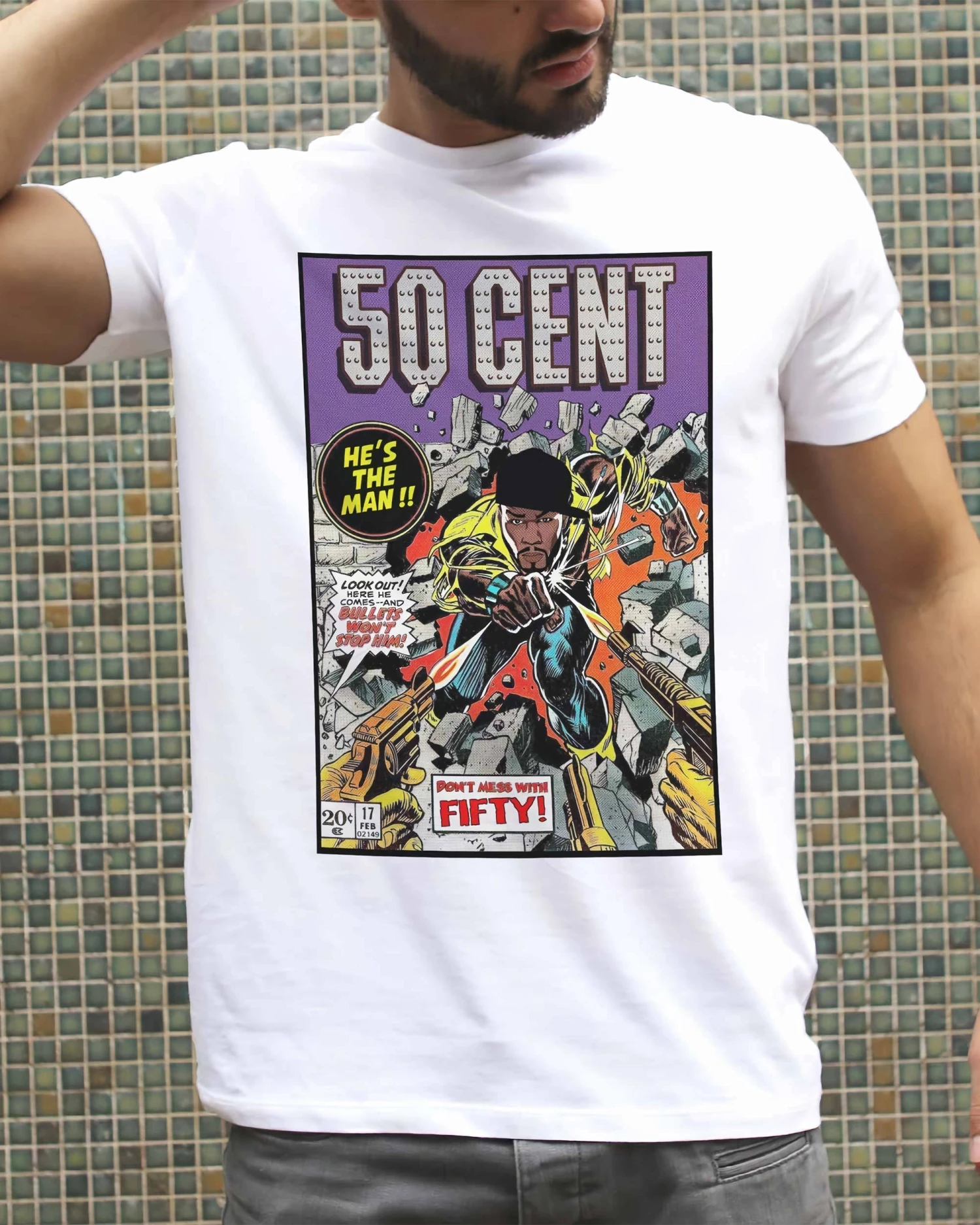 50 Cent, le super-héros du hip-hop US, illustré à la manière d’une bande dessinée comics. T-shirt de l’artiste Ads Libitum, qui prête ses super pouvoirs au rappeur new-yorkais à travers une composition bien colorée.