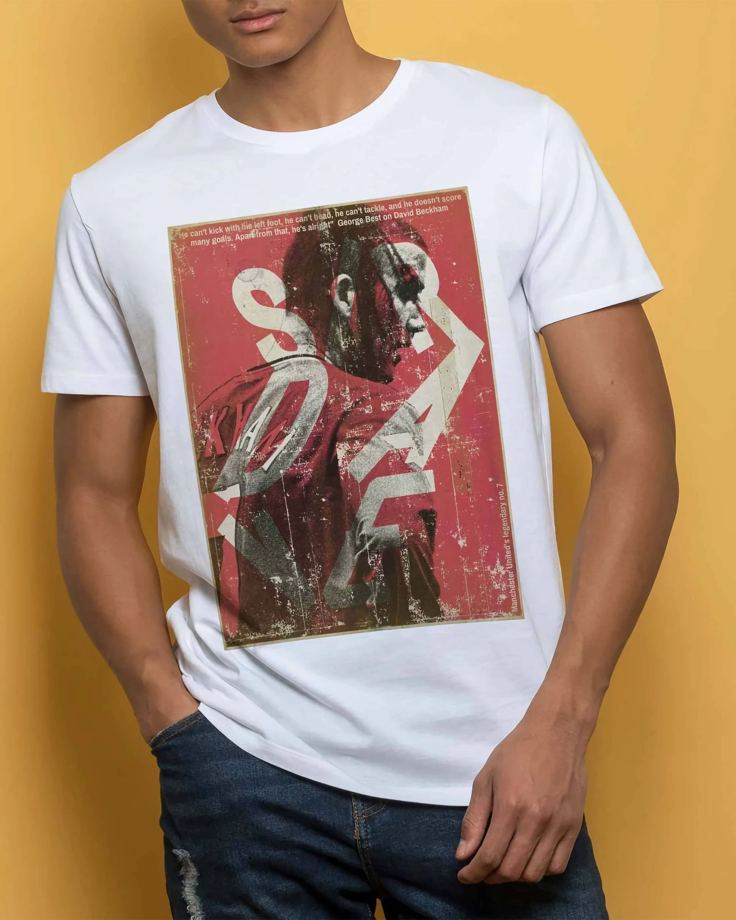 T-shirt à l’effigie du joueur de football David Beckham portant fièrement les couleurs de son club formateur : le Manchester United. Un modèle signé de l’artiste Zoran Lucic, imprimé sur un top pour homme allant du S au XXL. Composition 100% coton.