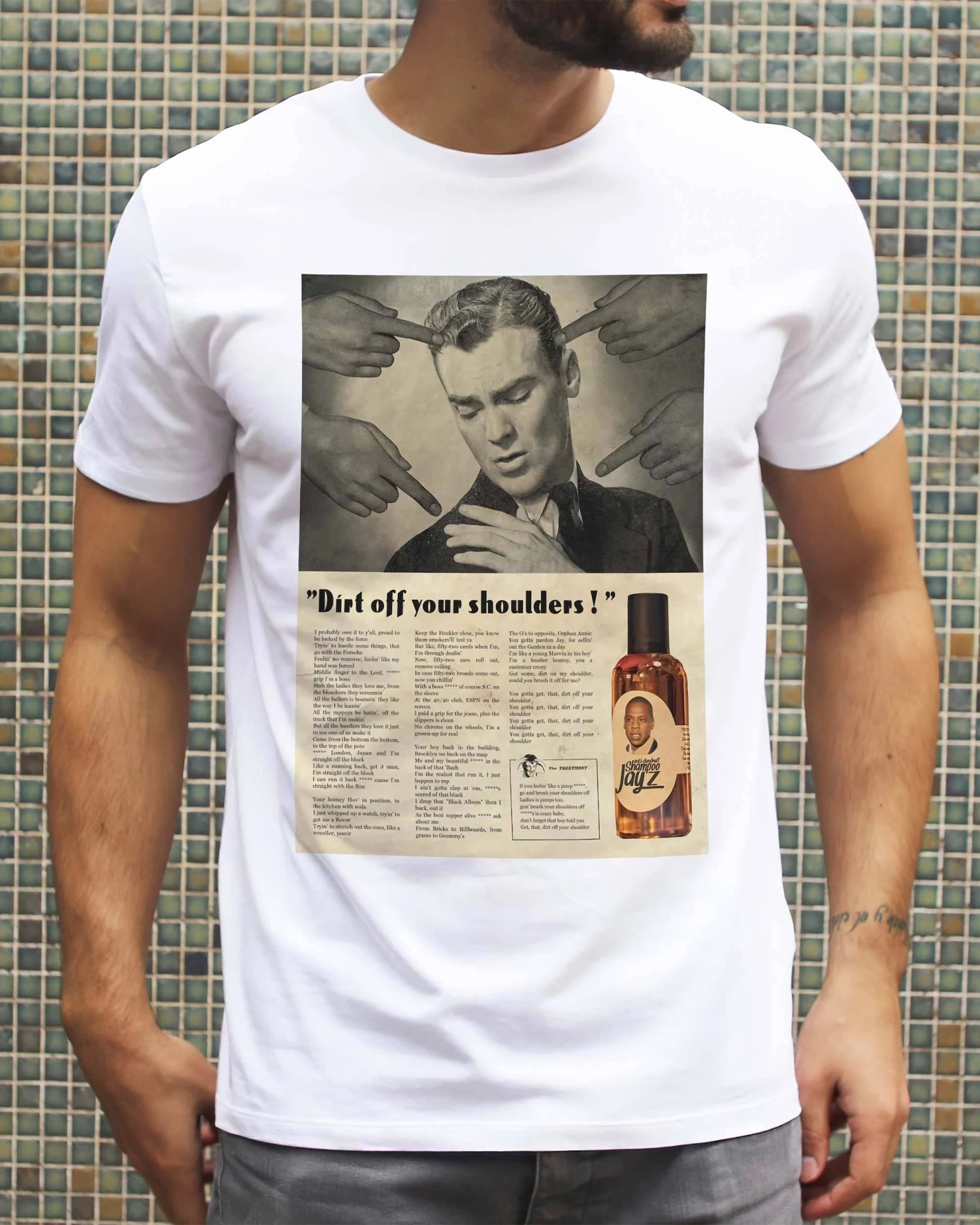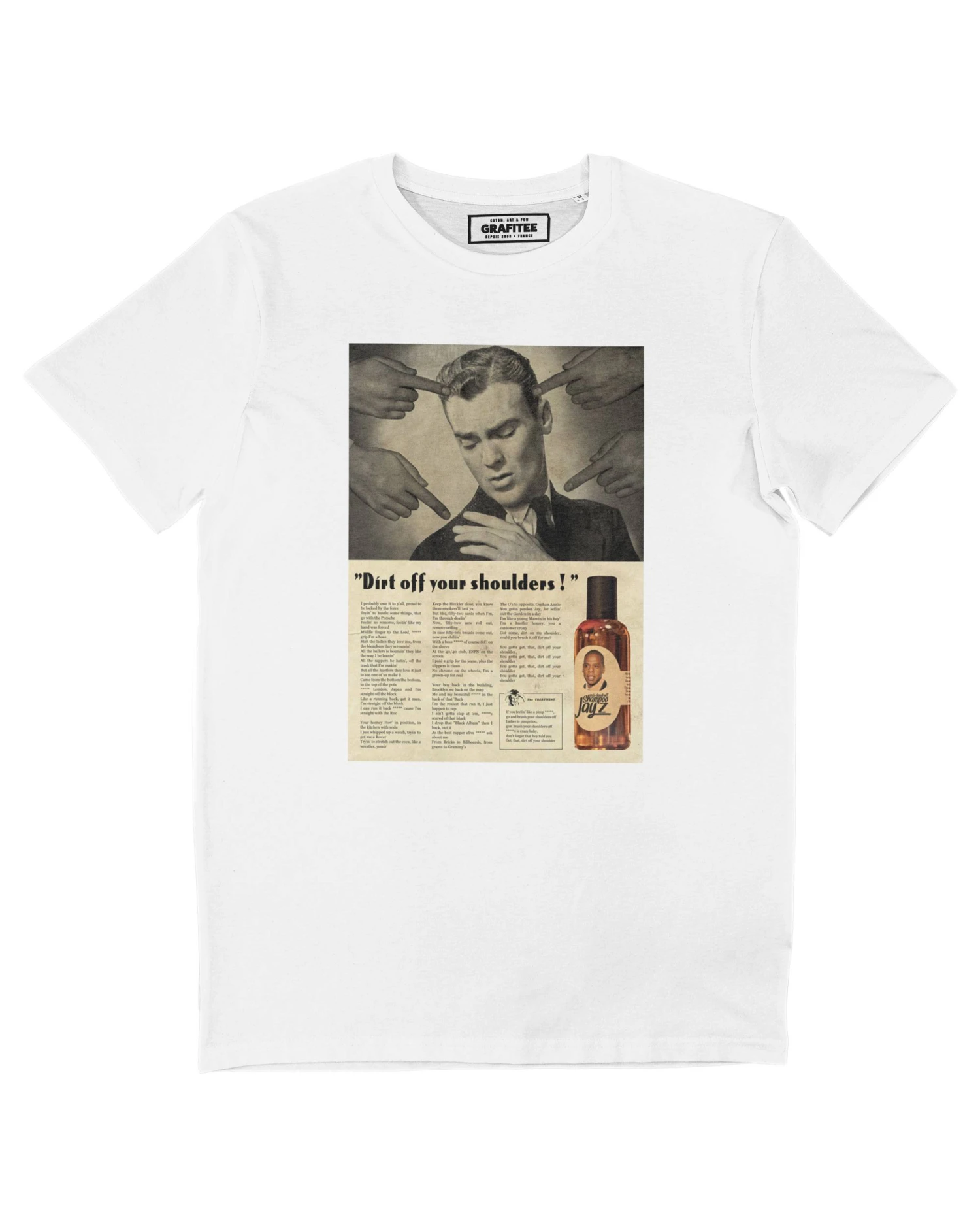 Ce T-shirt fait référence à la chanson « Dirt Off Your Shoulders » du rappeur Jay-Z. Un titre repris au pied de la lettre par l’artiste Ads Libitum, qui nous a concocté un petit shampoing antipelliculaire à l’effigie de l’artiste new-yorkais !