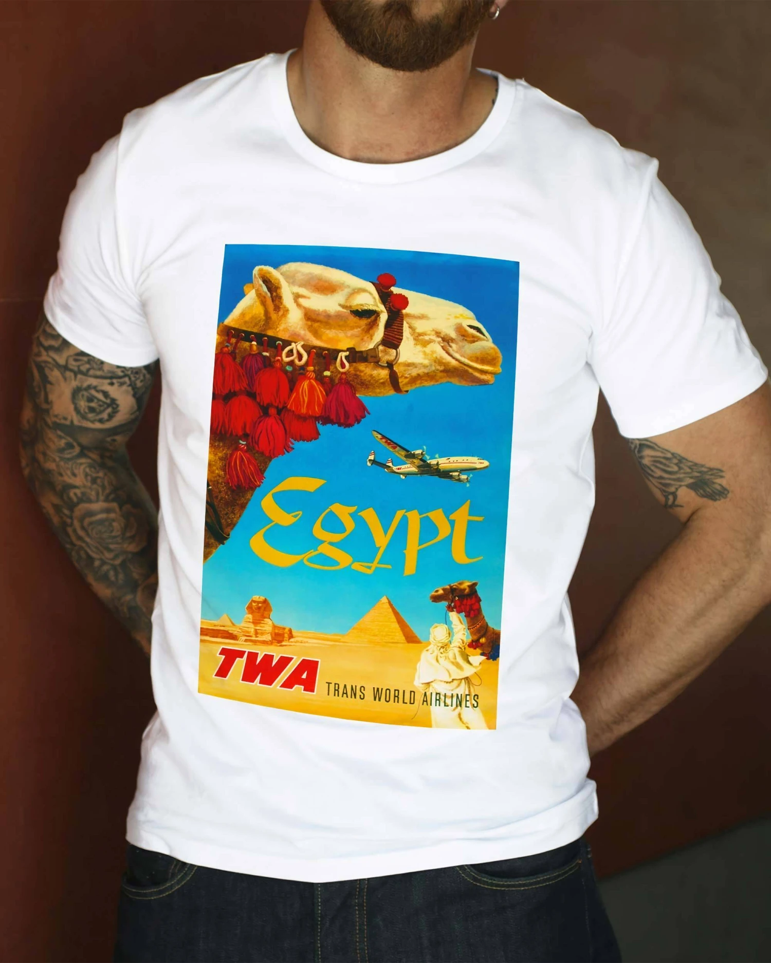 Attention, chameau en gros plan sur un T-shirt imprimĂ© d’une pub vintage pour la TWA. Toi qui rĂŞvait d’aller voir les pyramides ! Impression numĂ©rique sur un Tee-shirt 100% coton disponible du S au XXL.