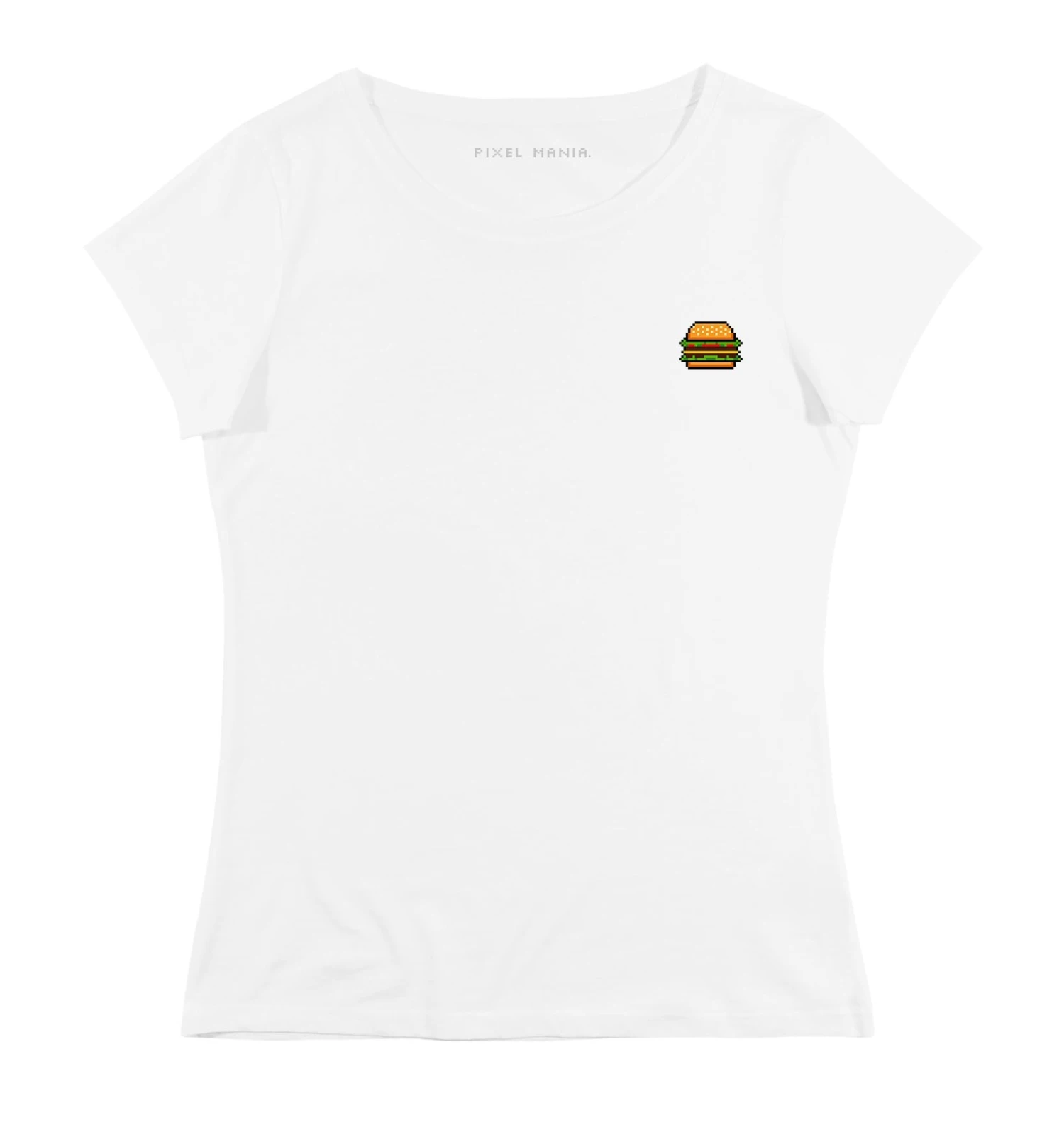 T-shirt pour femme 100% coton arborant un cheeseburger illustré en pixel art. Modèle de qualité premium, dans une une coupe ajustée. Encolure ronde avec bande de propreté. A commander sur place ou à emporter, du XS au XL ! Service express, retours gratuits :p