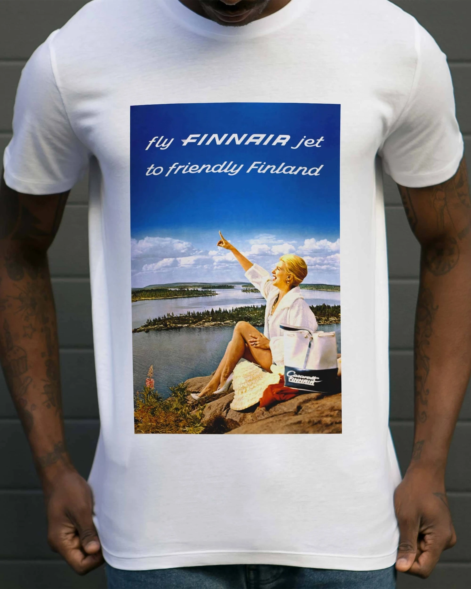 Un super T-shirt avec une illustration rétro d’une pub de la compagnie finlandaise Finir. Impression numérique en couleurs, sur un haut en coton 100%. Disponible dans toutes les tailles, du S au double XL.