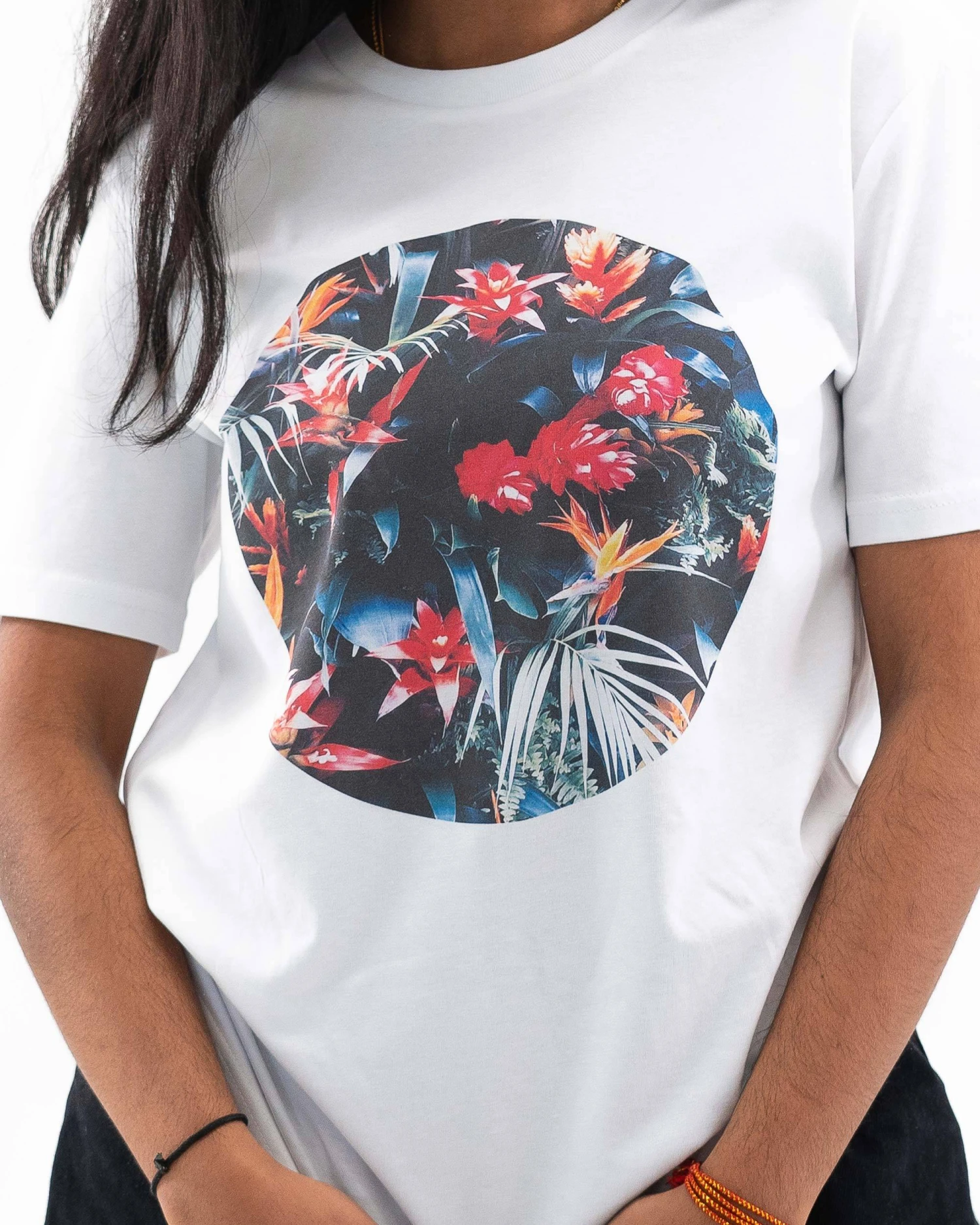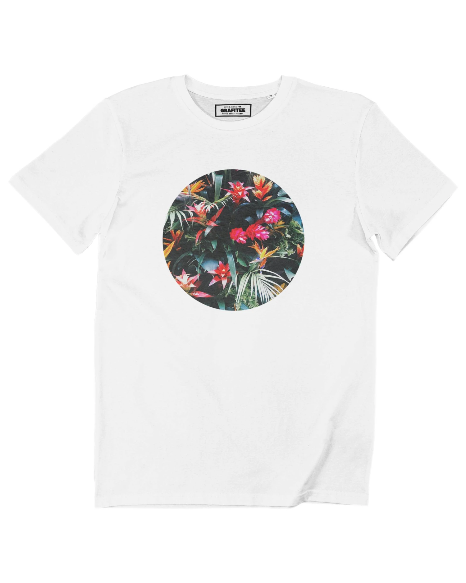 Tee-shirt pour homme imprimé de fleurs tropicales pour un look estival. Modèle 100% coton, imprimé en France.