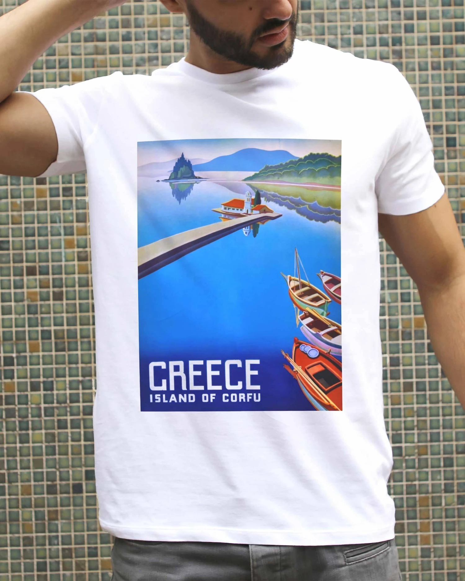 Pour un style décontracté et estival, commande ce T-shirt touristique avec une illustration rétro et design, des magnifiques eaux bleues de l’île de Corfu. Impression numérique en couleurs, sur un haut en coton 100% organique. Disponible dans toutes les tailles, du XS au triple XL.