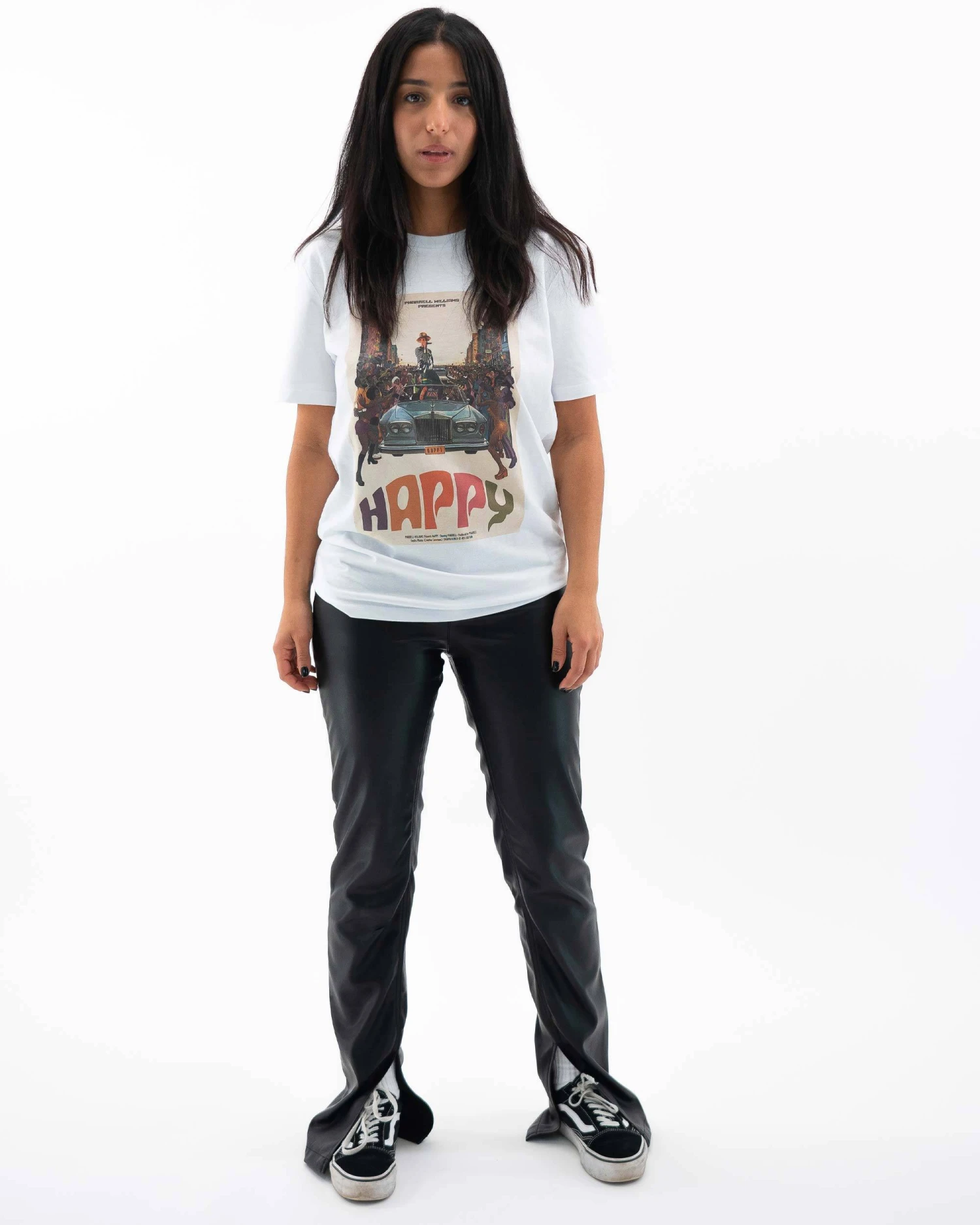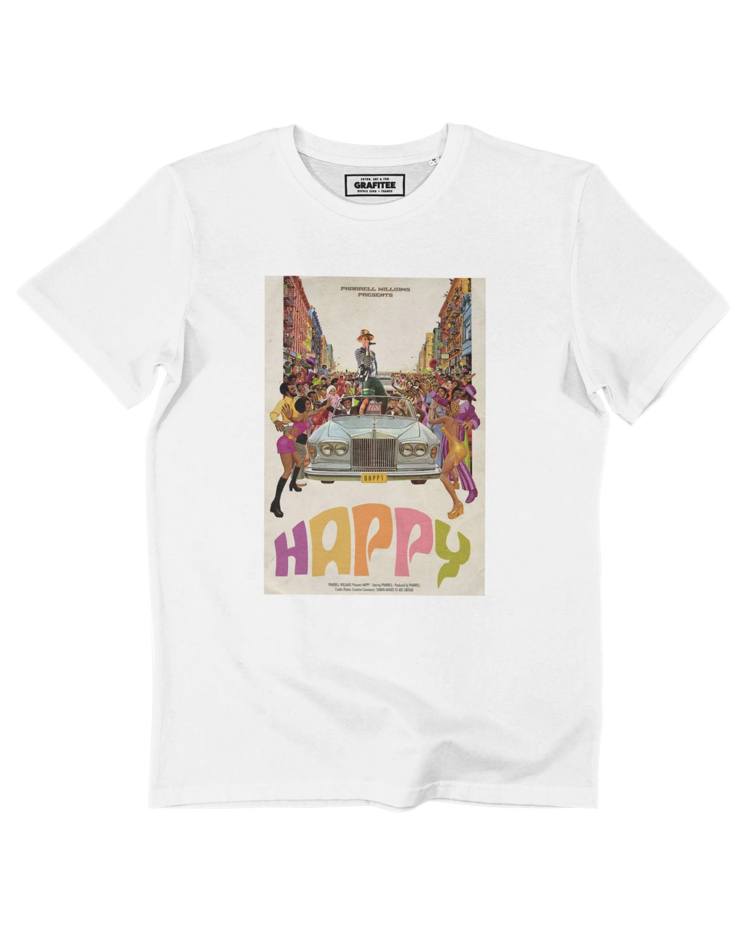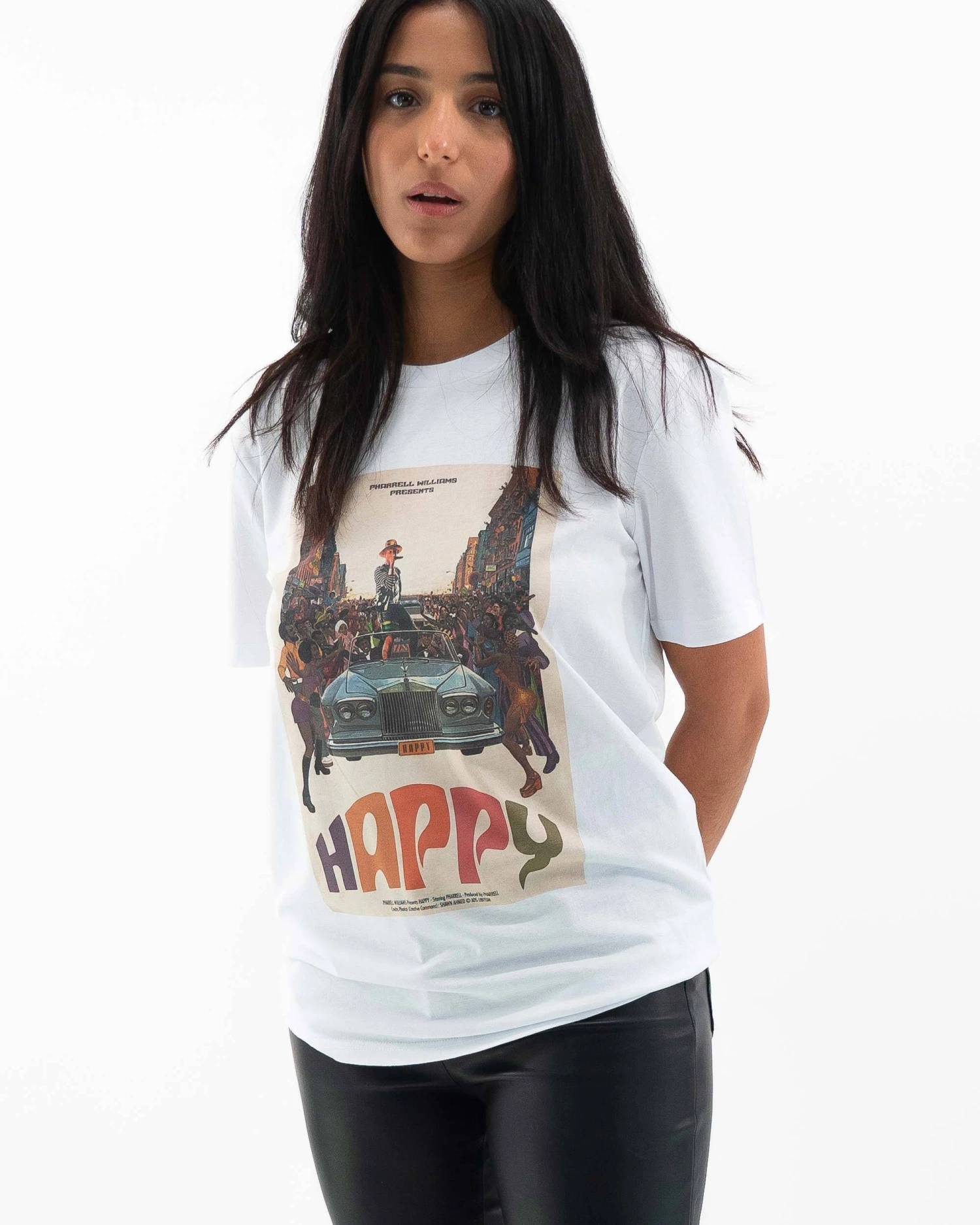 Un t-shirt Happy frais et coloré qui reflète parfaitement le titre éponyme du chanteur Pharrell Williams, sorti en 2013.