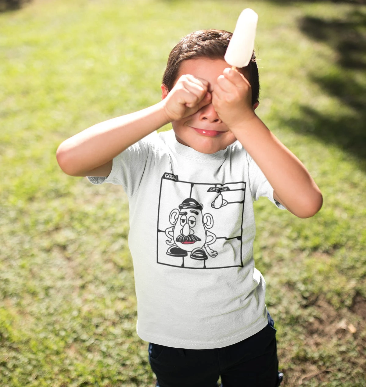 D’où vient Monsieur Patate de la série de dessins animés ? Ce t-shirt lève le doute et nous présente le petit personnage en forme de pomme de terre à monter soi-même à partir d’un kit en plastique.