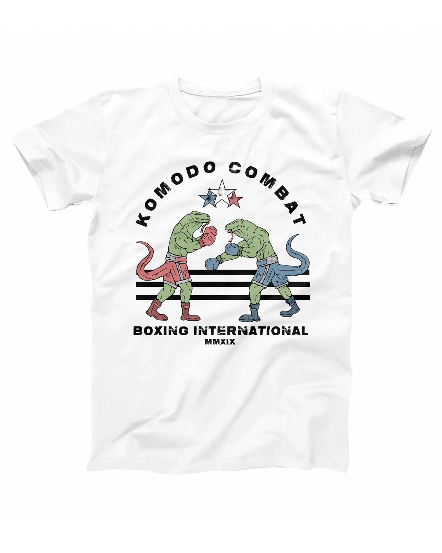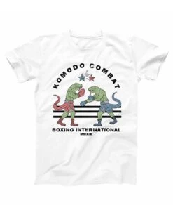 Pugilat au sommet entre deux varans de Komodo prêts à en découdre sur un ring en Indonésie, sans doute pour marquer leur territoire… T-shirt au visuel léger et vintage qui plaira aux amateurs de sports de combat.