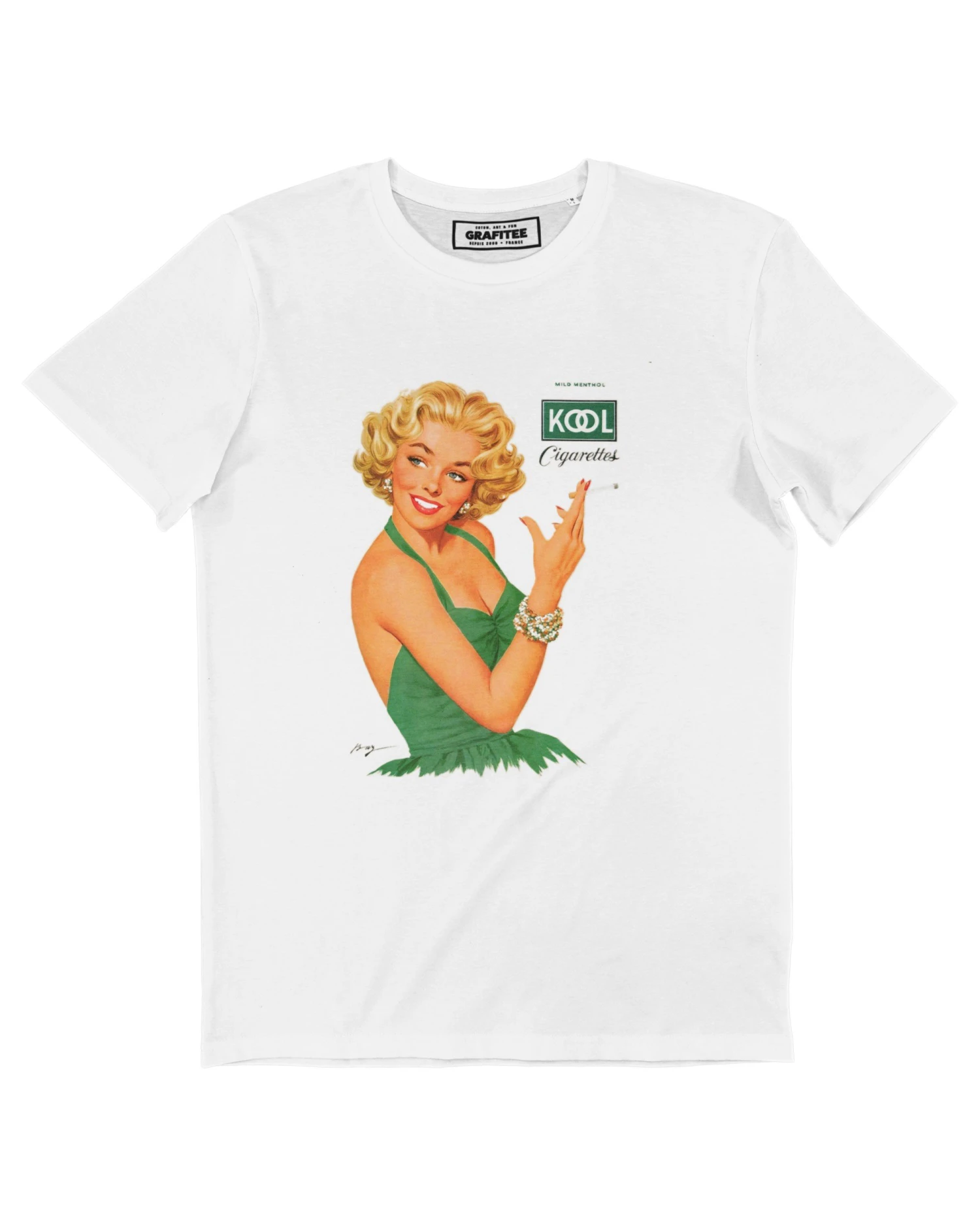 Une jolie blonde pin-up, un sourire enjôleur, et une cigarette : que demander de plus ? A défaut de l’avoir en vrai vous pouvez avoir cette pub pour la marque Kool, imprimée sur des tee-shirts en coton écologique, à col rond, disponible dans toutes les tailles.