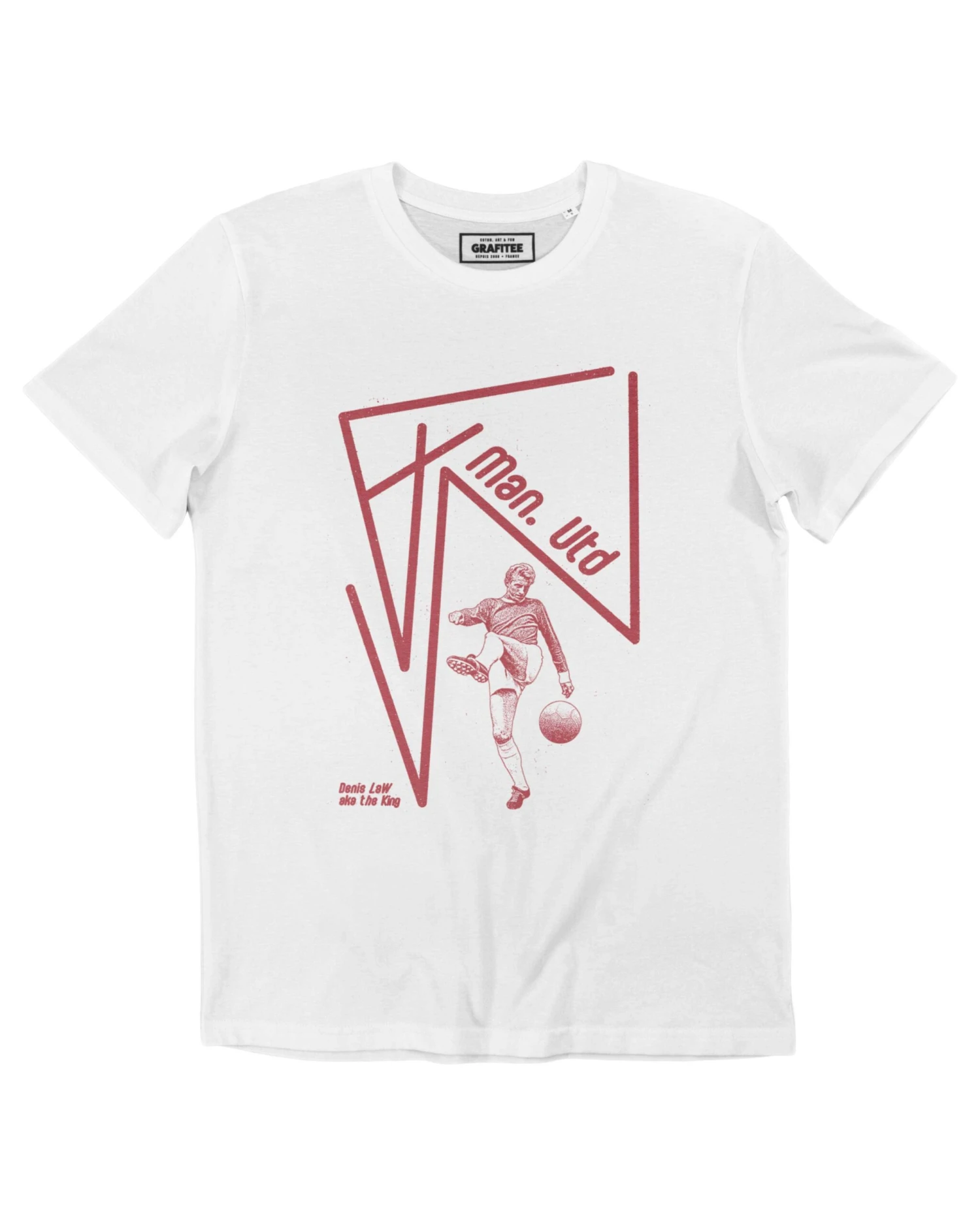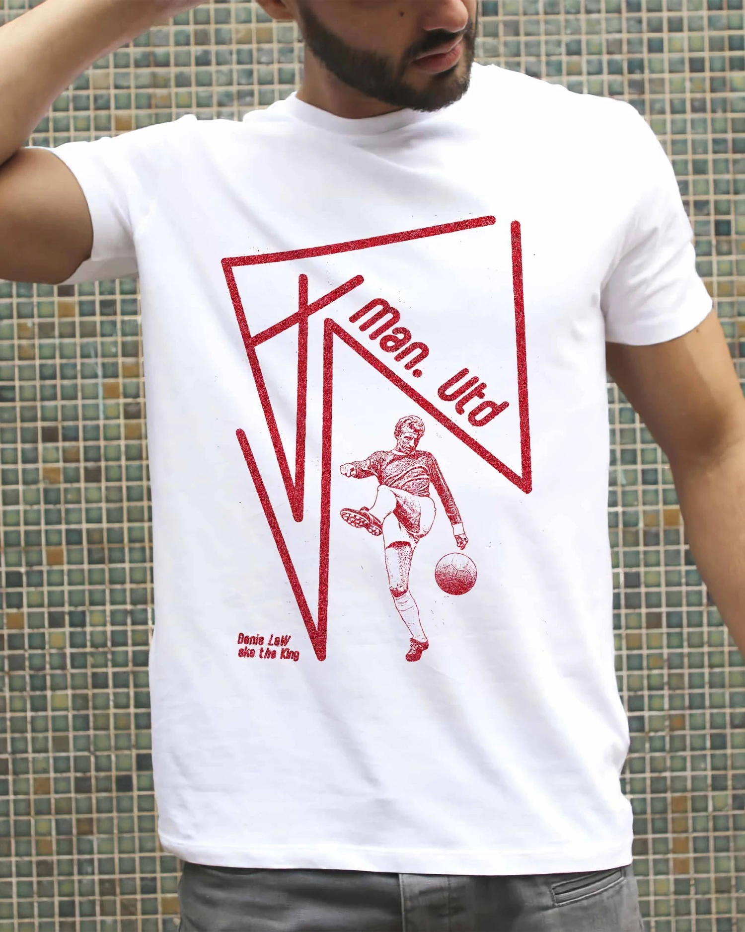 T-shirt Ă l’effigie de Denis Law, aka « The King » au club de Manchester United. Premier (et seul) footballeur Ă©cossais Ă remporter le ballon d’or (1964), Law fut plus rĂ©cemment fait Commander de l’ordre de l’Empire britannique.