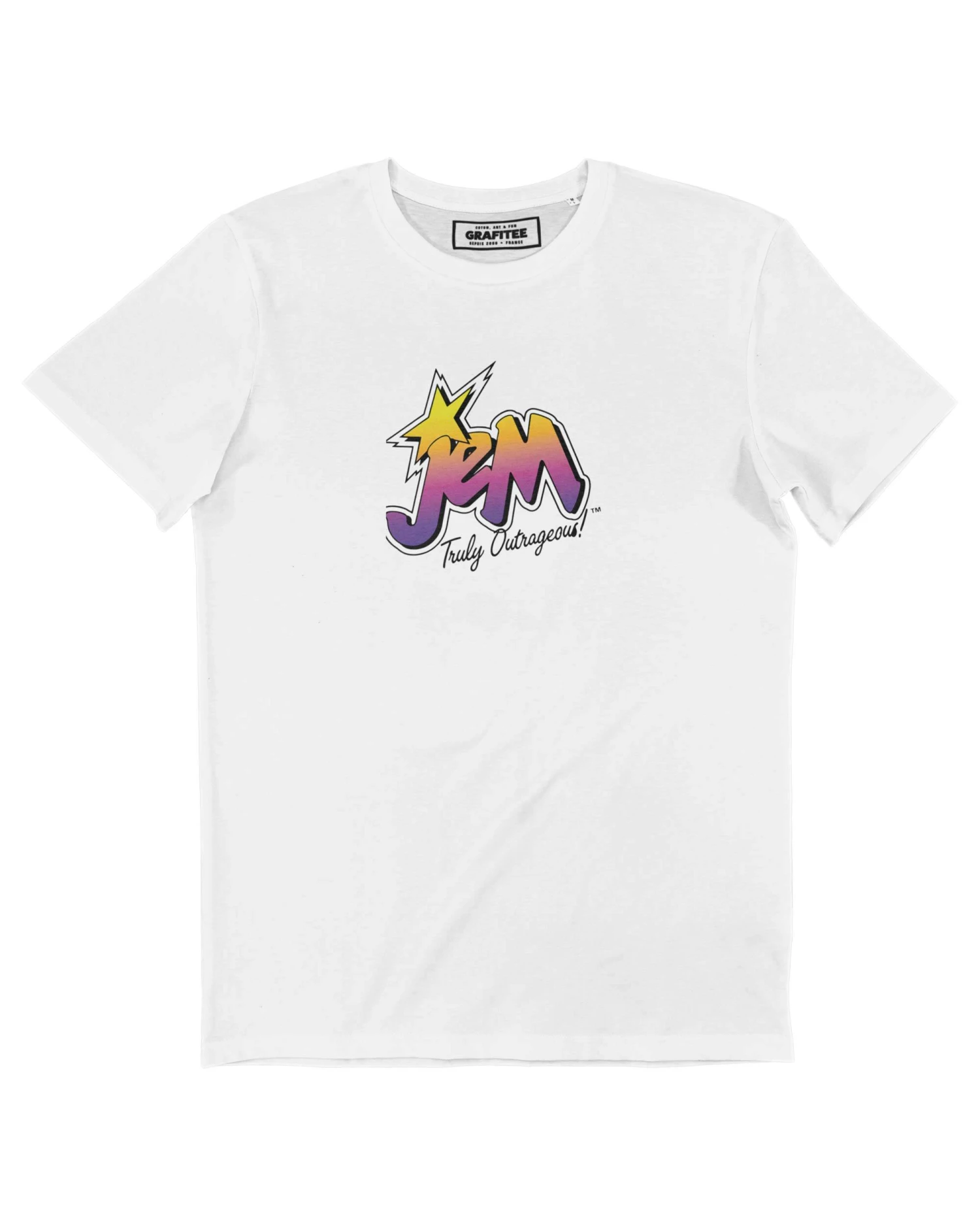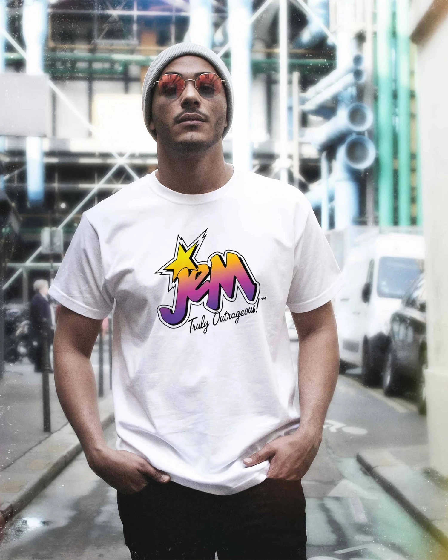Jem et les Hologrammes, le dessin animé culte des années 80, revient sur un T-shirt coloré arborant le logo flashy de la fameuse série télévisée. Une référence qui nous rappelle l’énorme échec commercial des poupées du même nom, qui n’ont jamais réussi à détrôner Barbie.