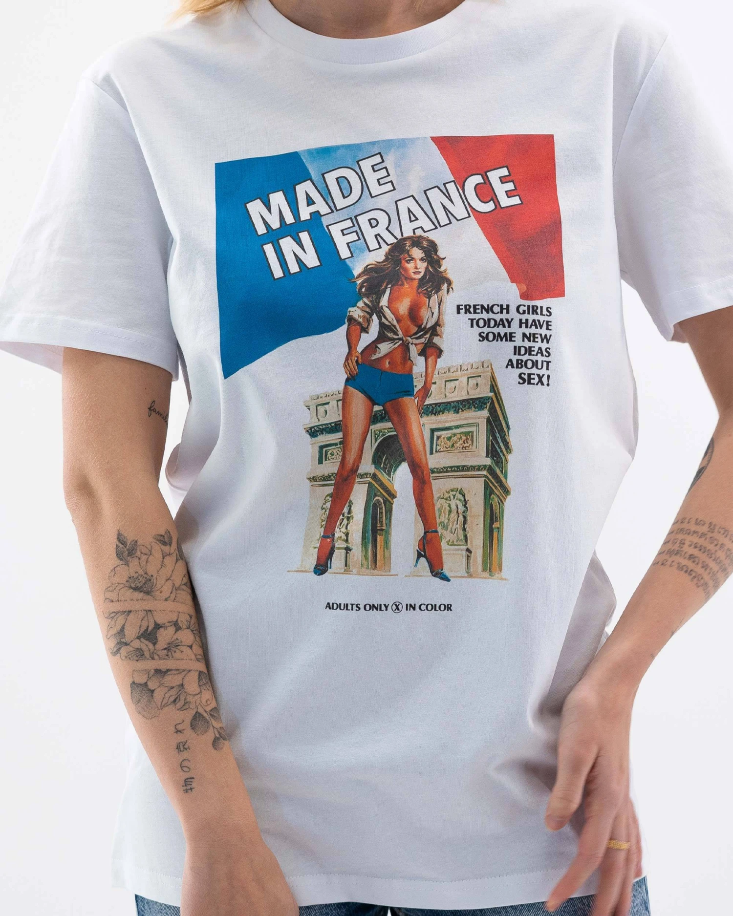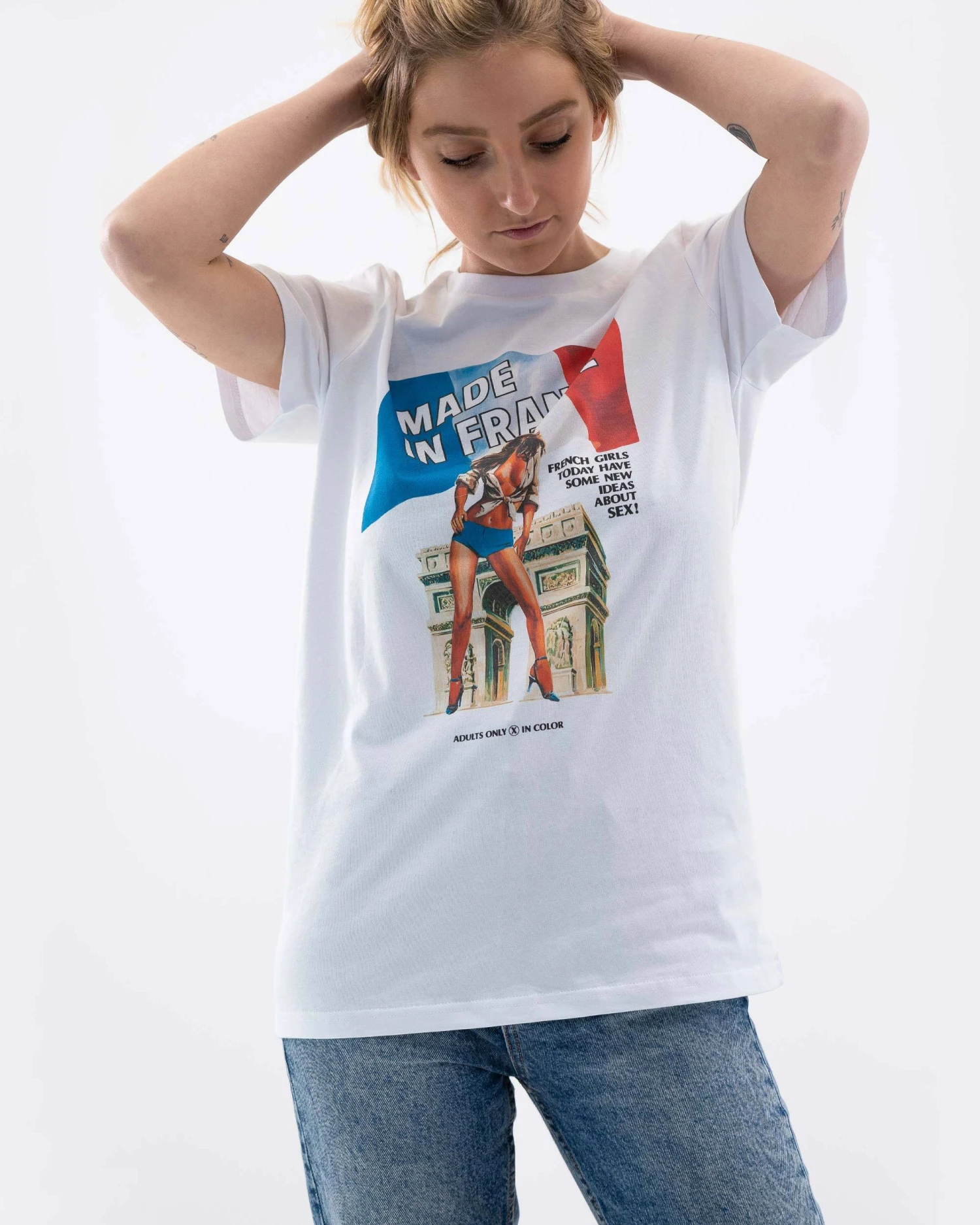 Le sublime t-shirt Made In France reprend l’affiche coquine du film éponyme pour adultes. Quoi de mieux pour représenter la France qu’une belle parisienne en talons hauts devant l’Arc de Triomphe et le drapeau tricolore.