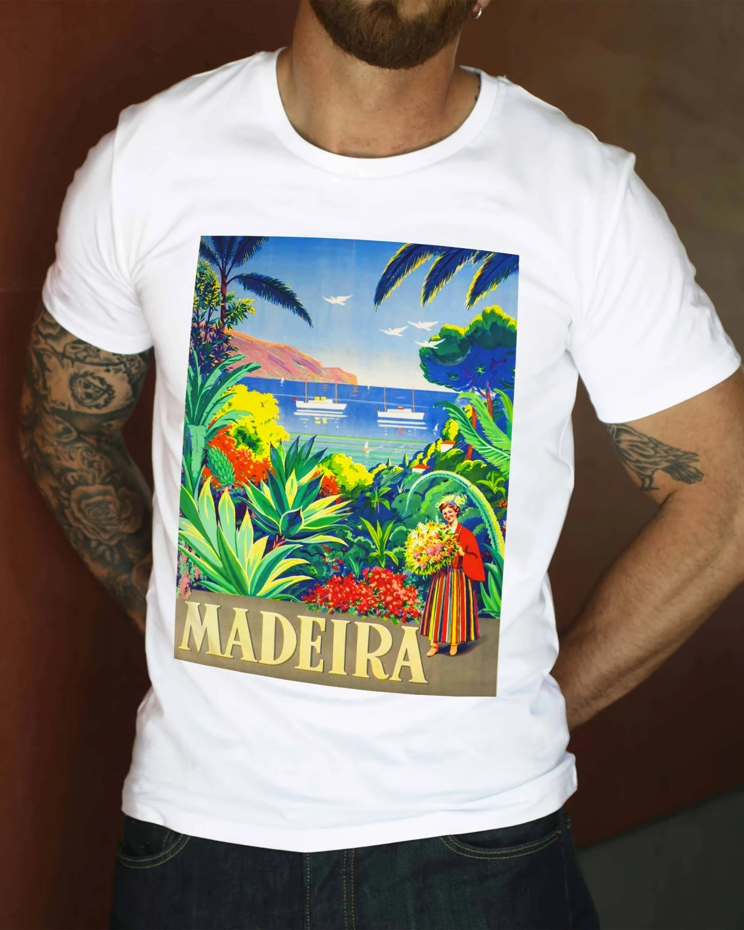 Un T-shirt haut en couleurs avec vue imprenable sur l’île portugaise de Madère. Création originale et vintage inspiré d’une vieille affiche publicitaire des années 60. T-shirt 100% coton – disponible du XS au 3XL – pour un look estival, même en plein hiver ! Sim Senhor.