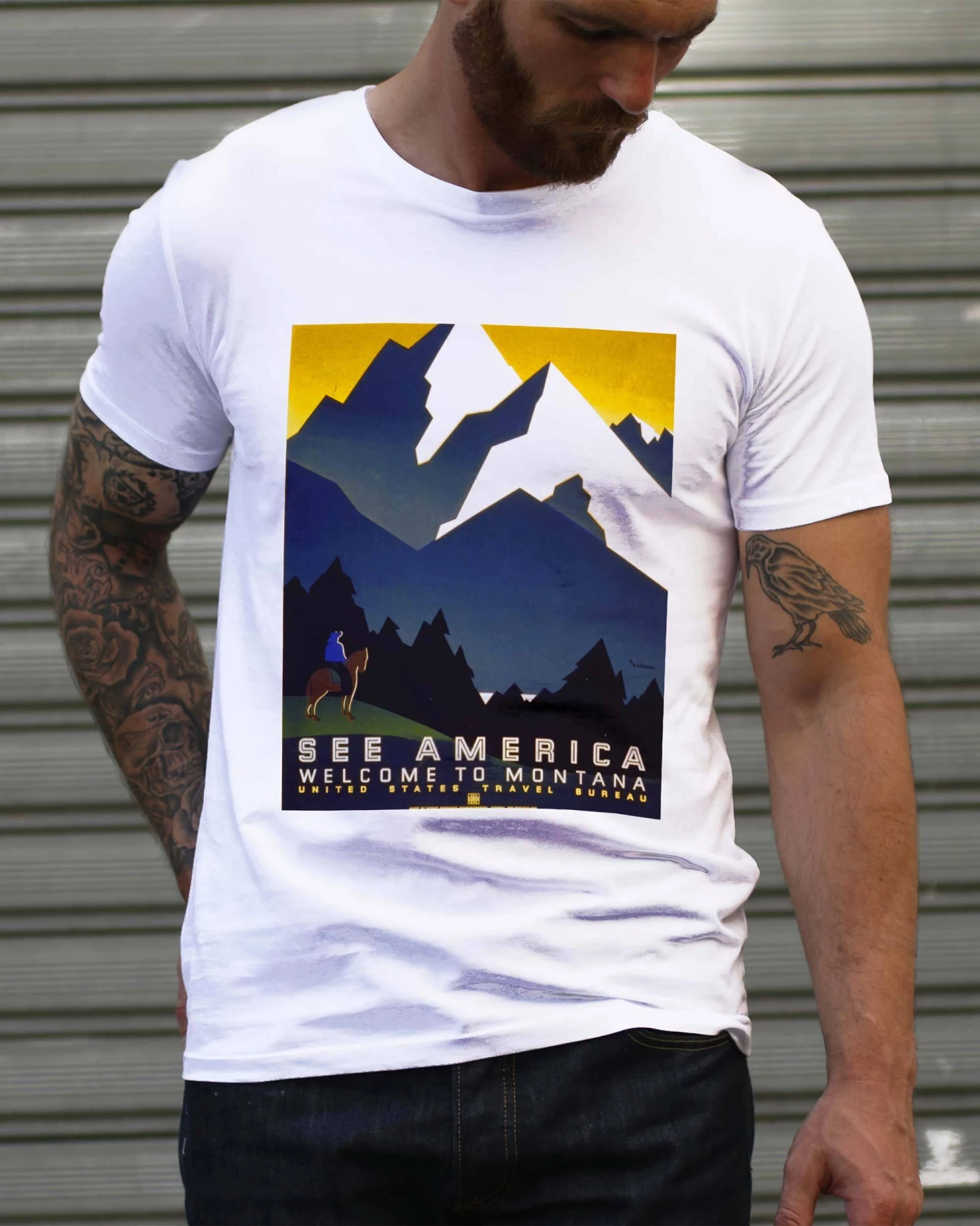 Commande ce T-shirt du Montana pour découvrir l’Amérique profonde des cowboys à cheval et des forêts denses. Un Tee shirt très graphique avec une affiche datant des années 50. Impression numérique en couleurs. Coupe homme en coton. Disponible en plusieurs tailles. Du extra small au triple XL.