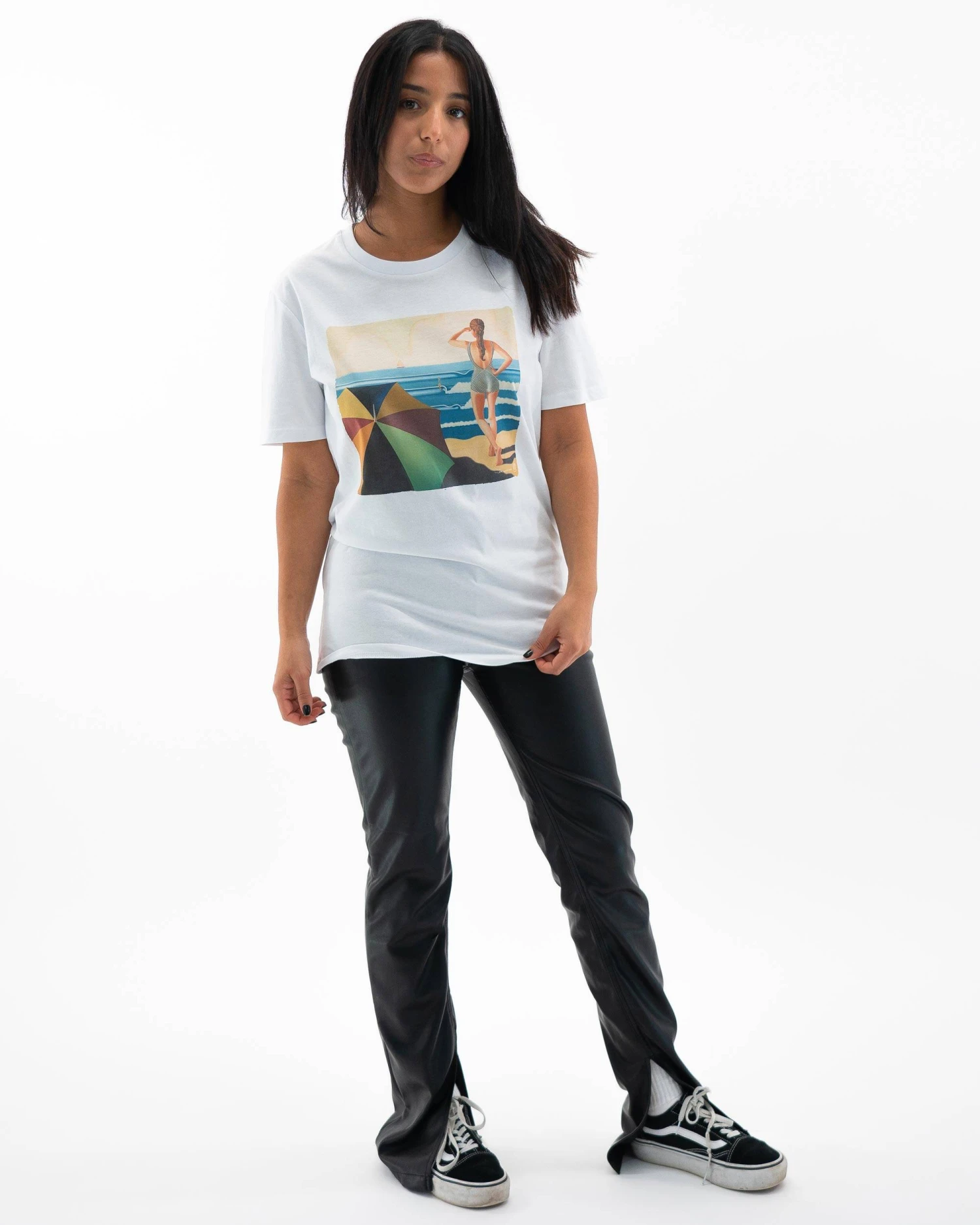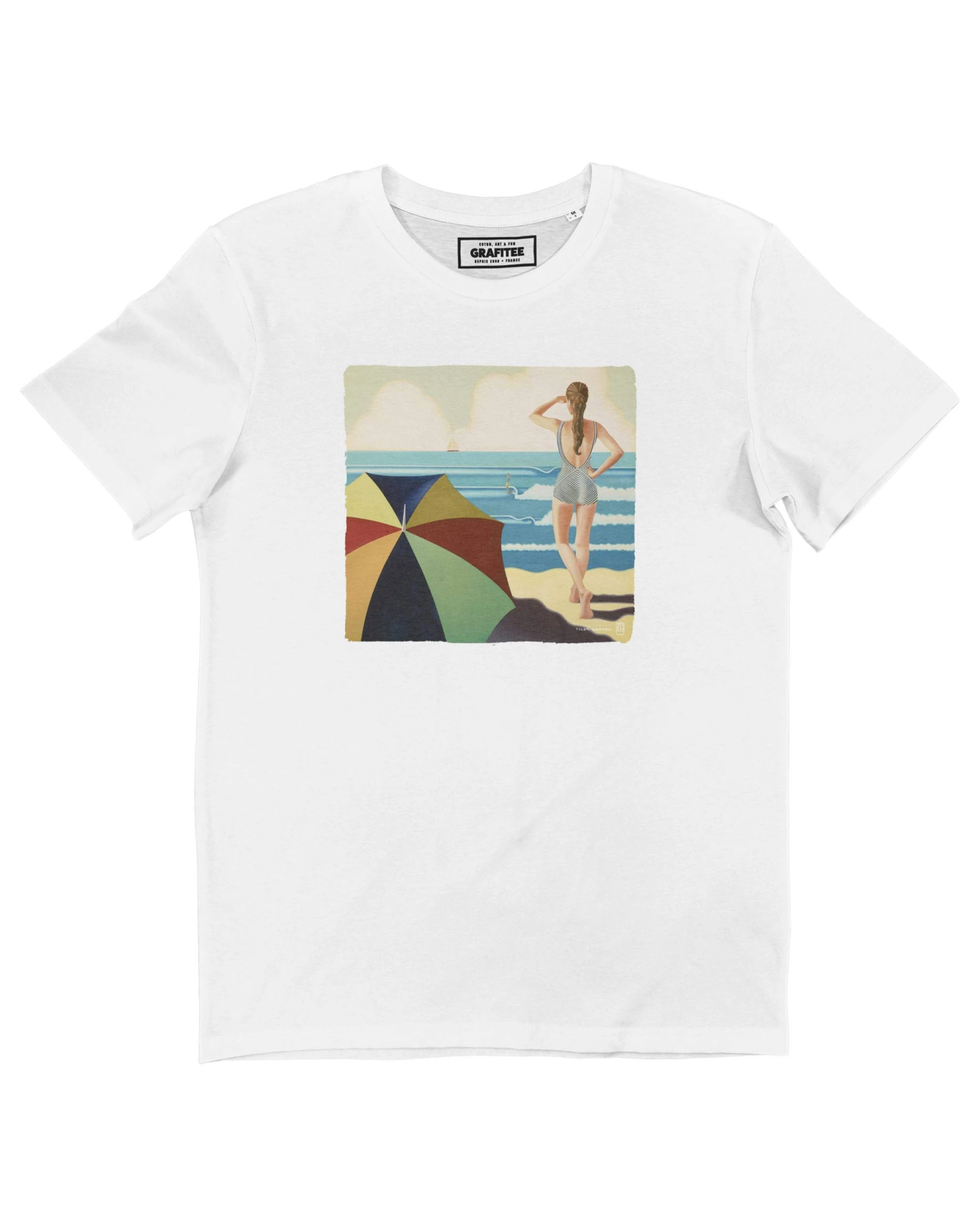 Calme, douceur et sérénité… Un t-shirt avec une peinture d’une scène au bord de la plage. Elle contemple en maillot de bain son surfer en train de s’amuser dans les vagues au loin. Reviendra-t-il au rivage ?