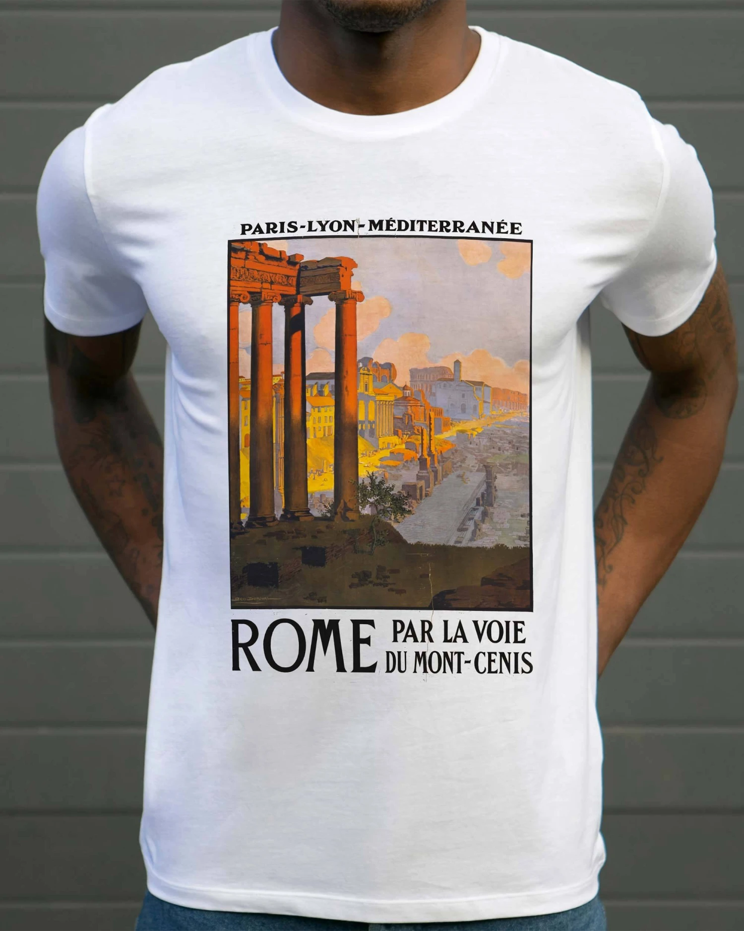 Un point de vue unique sur les vestiges de Rome, sous la lumière orangée d’un coucher de soleil italien. T-shirt proposé dans une coupe pour homme droite, du XS au XXXL. La livraison est offerte sur ce produit.