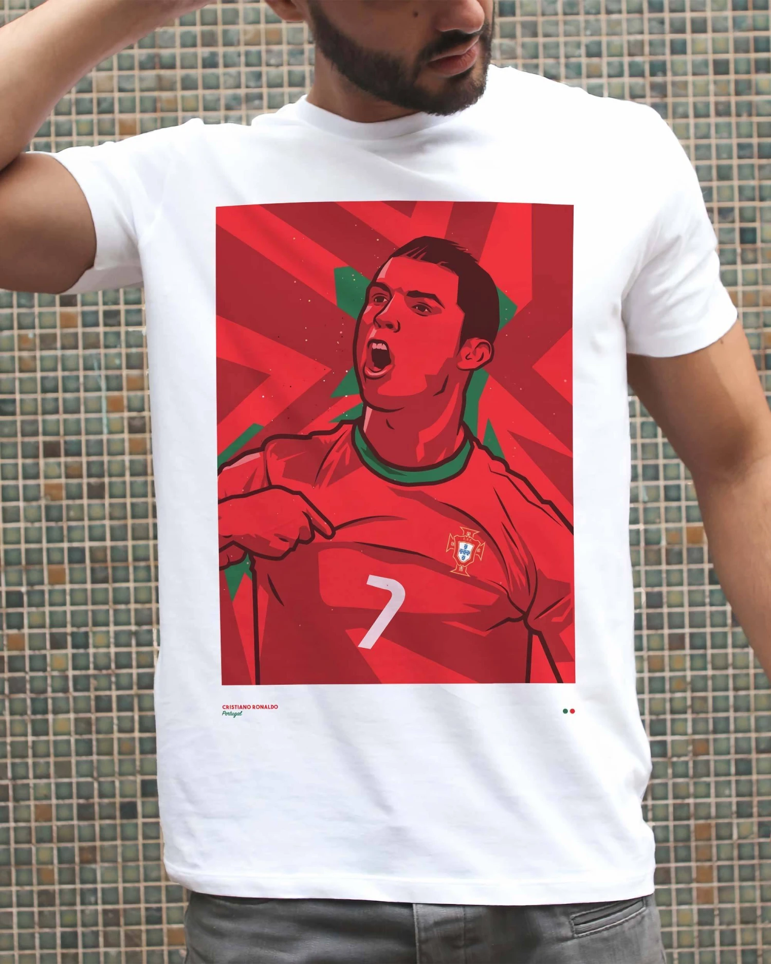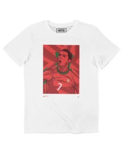 Cristiano Ronaldo avec son maillot préféré : celui du Portugal. Un T-shirt aux couleurs rouge et vert de la Seleção das Quinas, la sélection de l’équipe de football portugaise. A commander du S au 2XL, en exclusivité sur Grafitee.