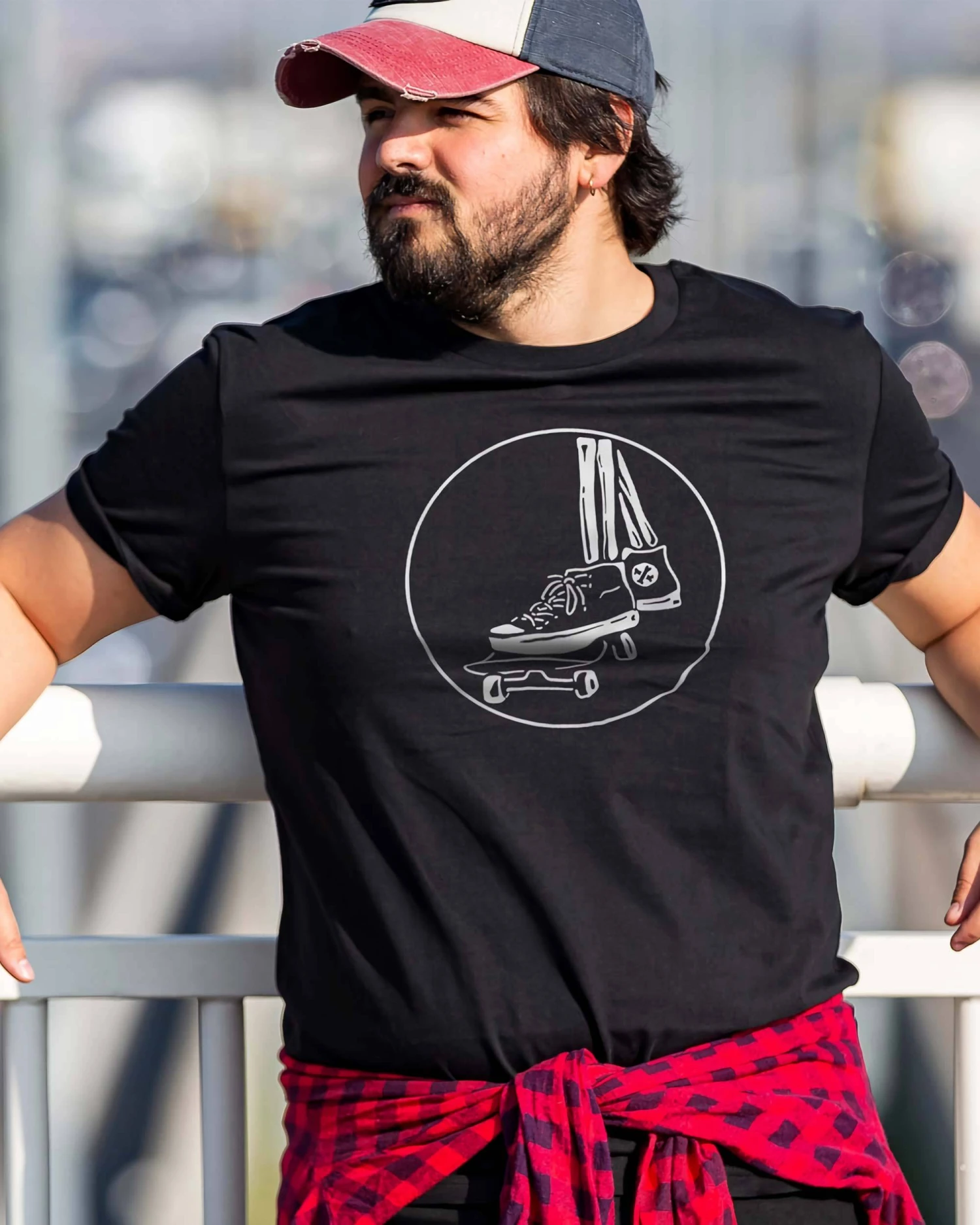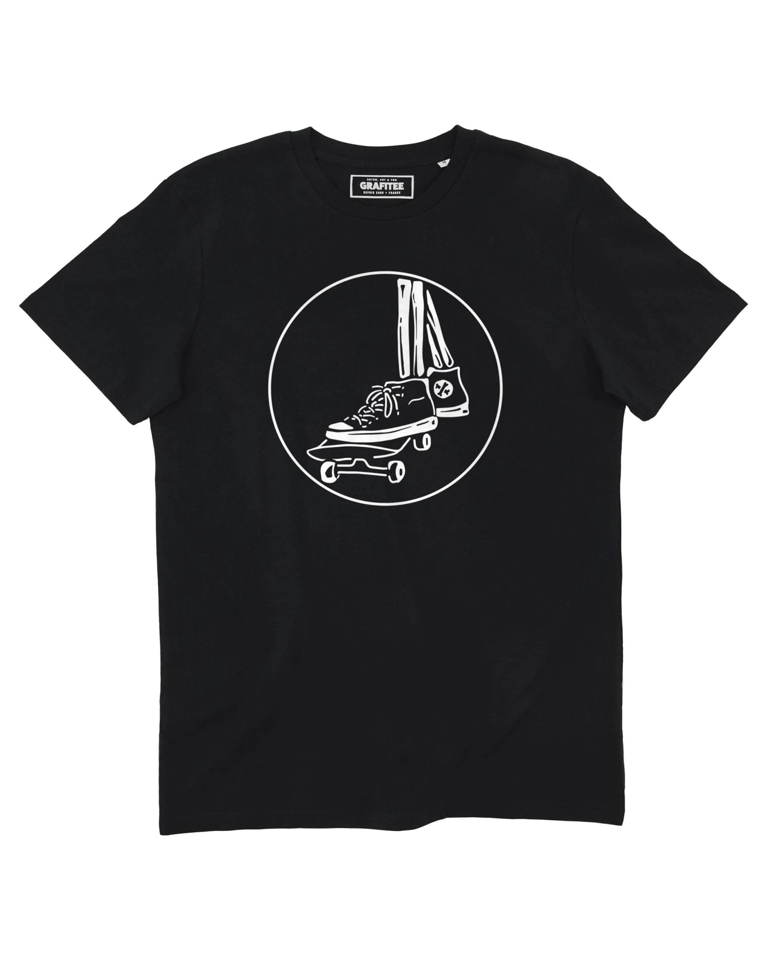 Les skaters passant leur journée à rider se reconnaîtront dans ce visuel. Le t-shirt Skate Skelly représente un squelette en train de faire du skate. Gros plan sur ses Converse au bout de ses os.
