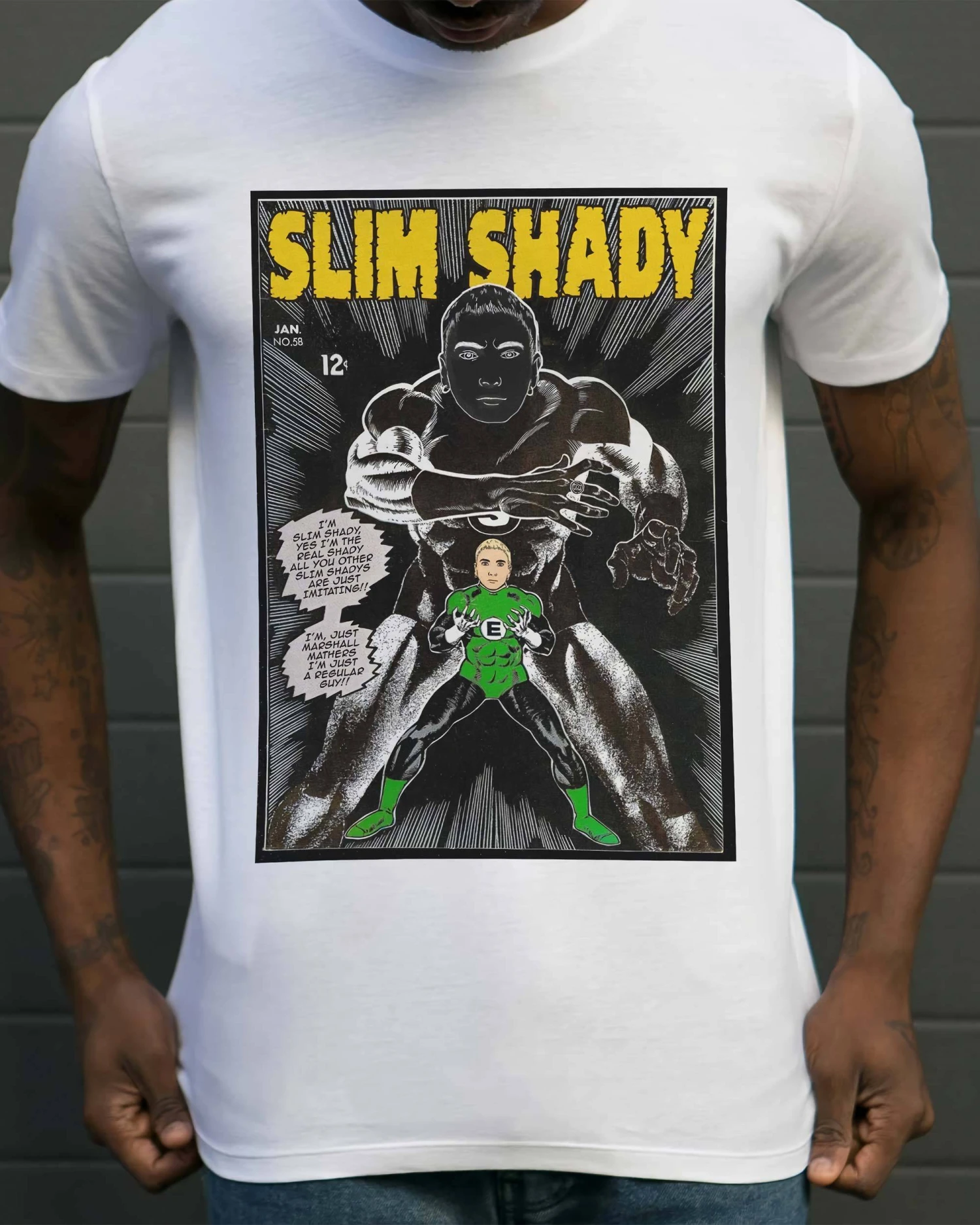 Voilà ce que ça donne quand Slim Shady se transforme en super-héros ! Un personnage trapu et bien cool inspiré du rappeur américain Eminem, dessiné à la manière d’une bande dessinée US.