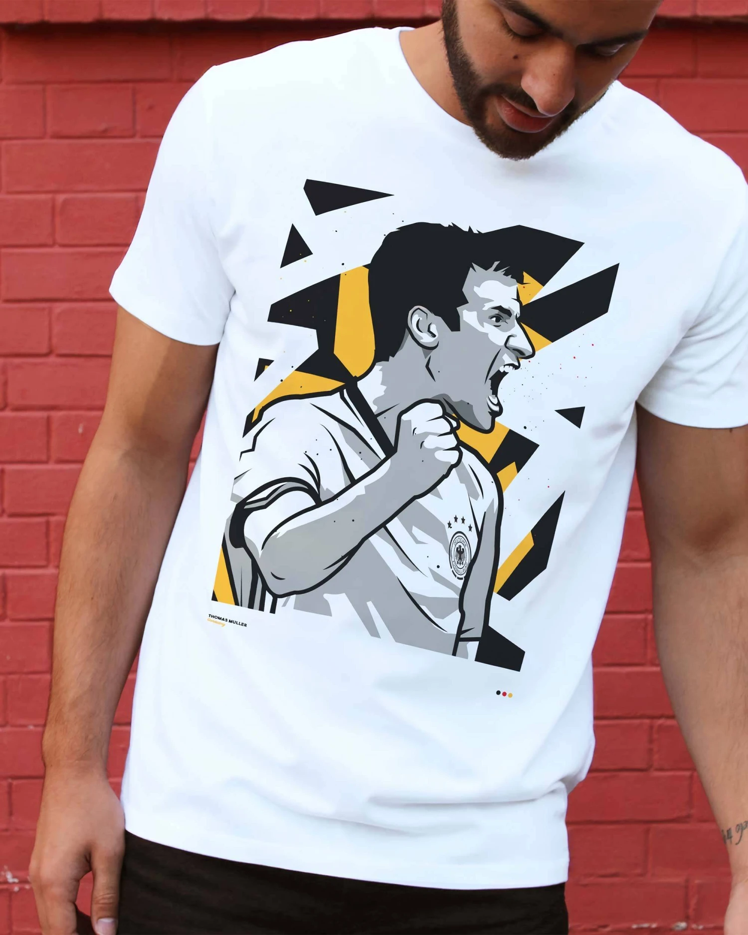 Surnommé « l’homme sans muscles » pour son physique rachitique, le milieu offensif du Bayern s’est néanmoins rendu indispensable avec la Mannschaft. Ce qui lui vaut ce T-shirt bien pétant réalisé à l’occasion de la dernière coupe du monde.
