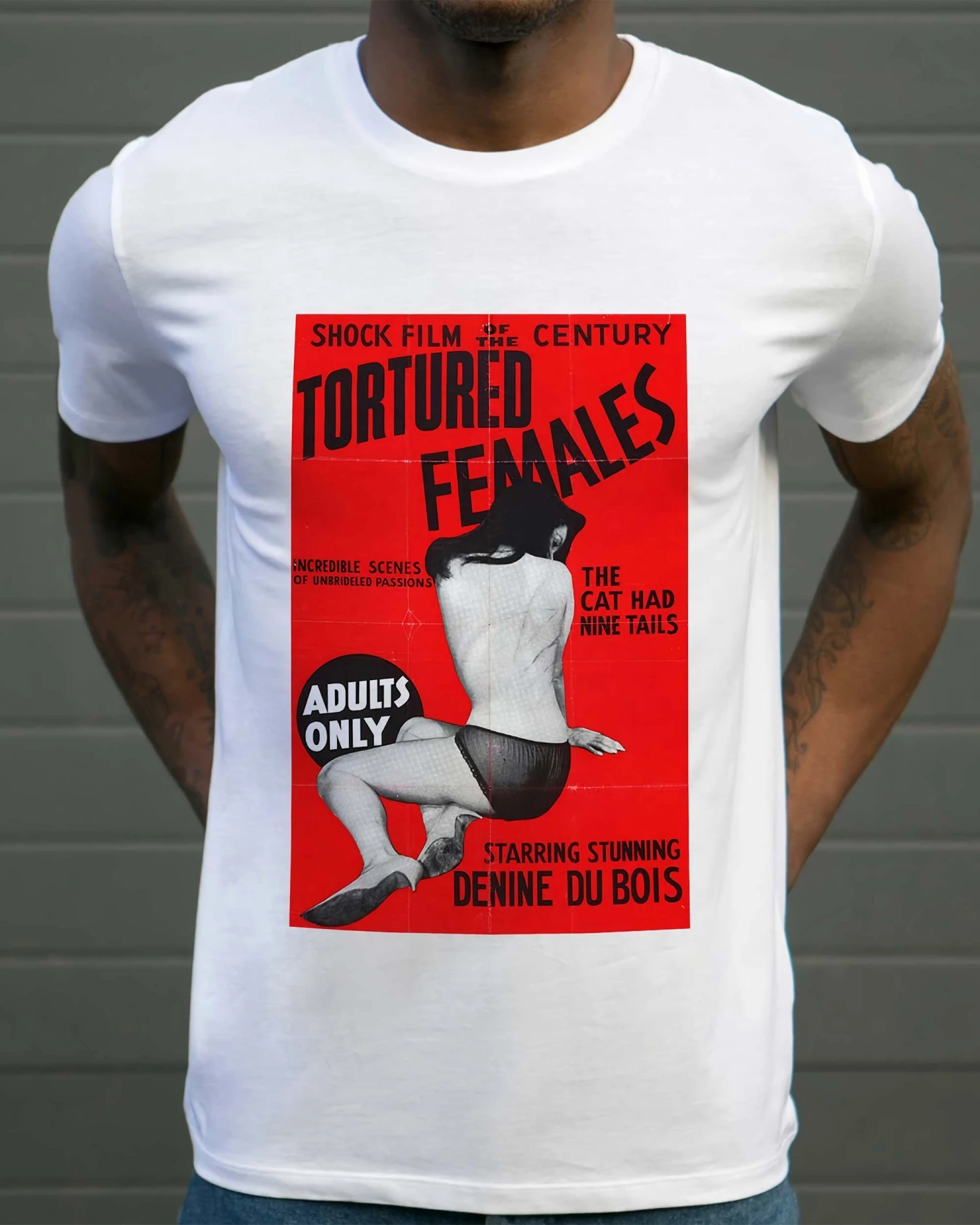 Pour célébrer les film X kitsch de l’époque voici le t-shirt Tortured Females.
