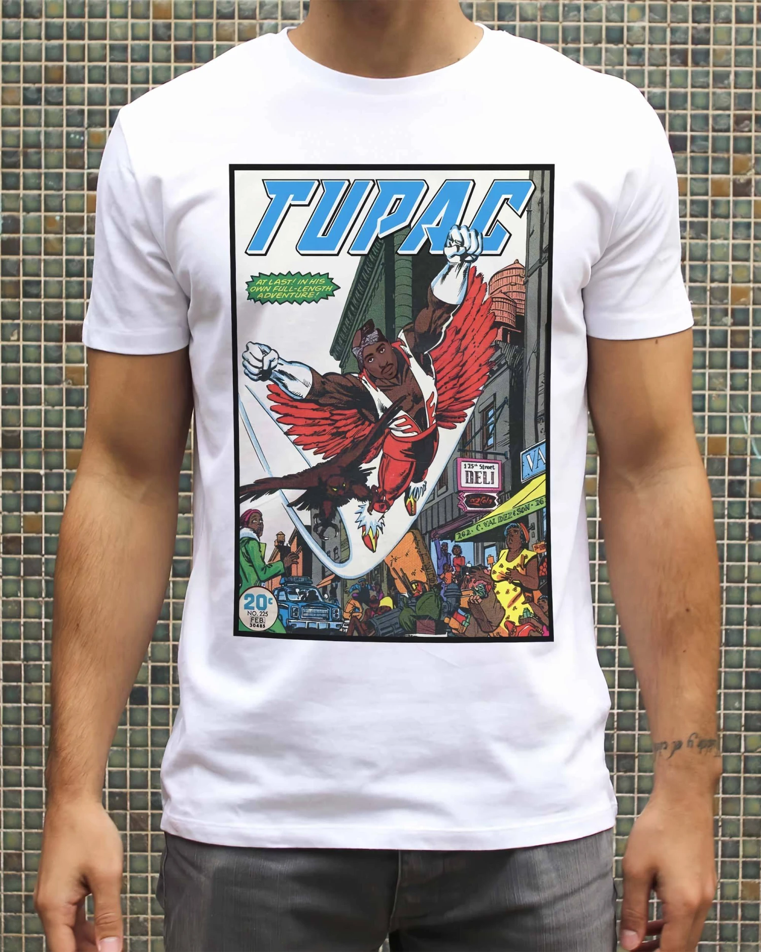 T-shirt graphique à l’effigie de Tupac, déguisé en super-héros. Top 100% coton proposé dans toutes les tailles, du S au 2XL. Livraison express 24/48h. Illustration de style comics, signée Ads Libitum.