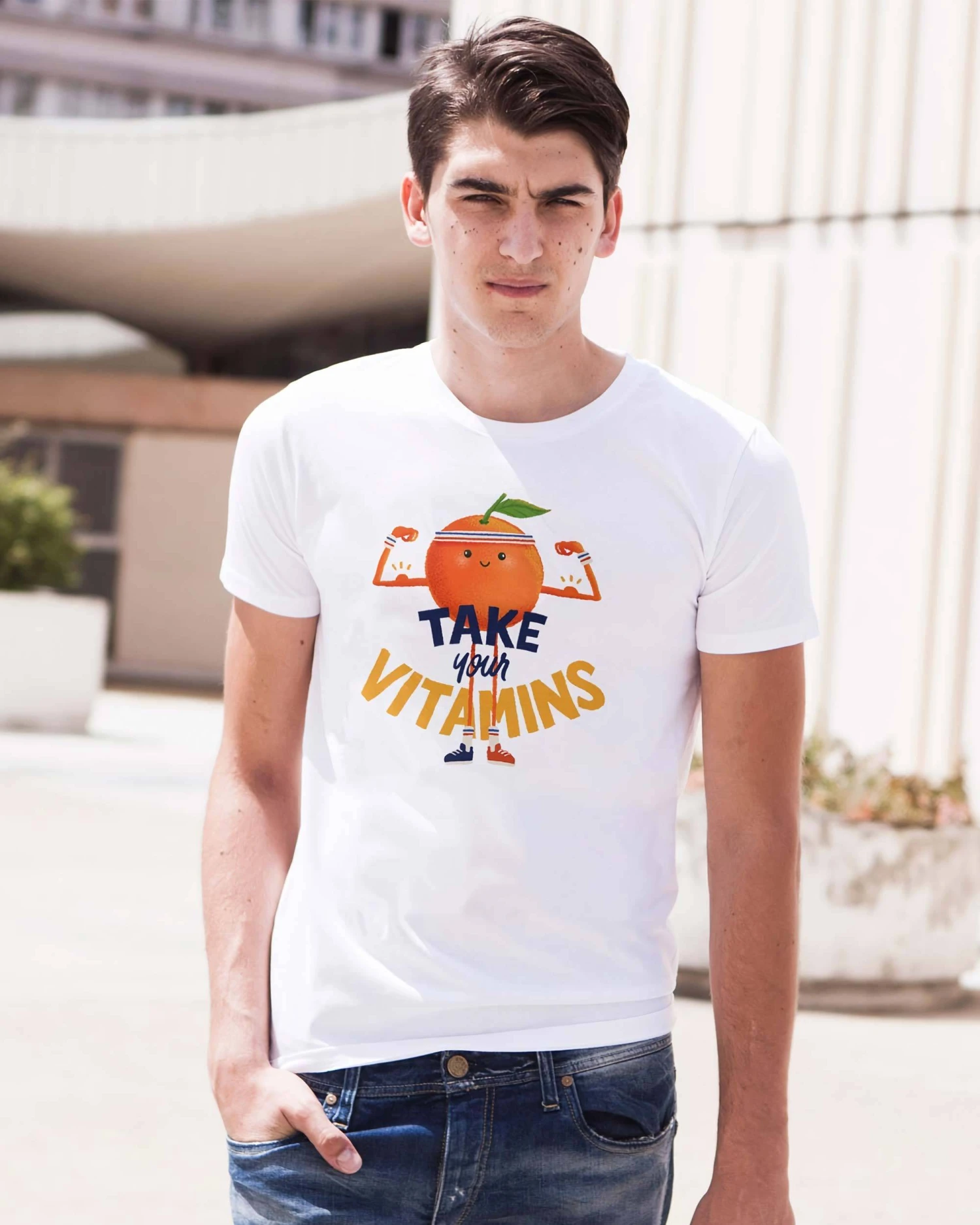 Pour un grand sportif comme toi qui mange ses 5 fruits et légumes par jour. T-shirt Vitamines avec une illustration d’une orange en tenue de sport et qui a la pêche.